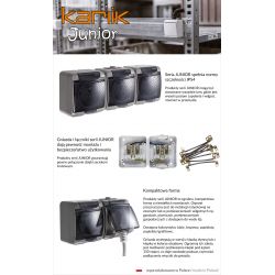 Produkt polski uznanej firmy Karlik Elektrotechnik. Produkty serii JUNIOR to zgrabna, kompaktowa forma o niewielkich rozmiarach. Osprzęt przeznaczony jest do instalacji natynkowej na zewnątrz lub w pomieszczeniach wilgotnych np. garażach piwnicach, pomieszczeniach gospodarczych z dostępem do wody itp.