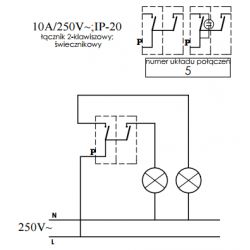- łączniki (uniwersalny- spełniający funkcję wyłącznika 1-biegunowego i schodowego, świecznikowy, schodowy podwójny, krzyżowy, uniwersalny zwierny, żaluzjowy zwierny oraz żaluzjowy);