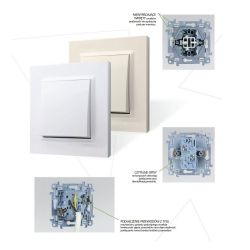 Osprzęt funkcjonuje jako system ramkowy, symetryczny (1, 2, 3, 4, 5 krotny) umożliwiający zamontowanie wyrobu w opcji poziomej i pionowej. Dzięki czterostopniowemu zatrzaskowi ramki montaż jest możliwy nawet na nierównych ścianach. Moduł instalujemy w standardowej puszce Ø60 za pomocą śrub lub pazurków.