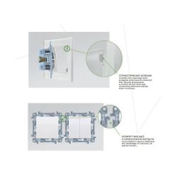 Osprzęt funkcjonuje jako system ramkowy, symetryczny (1, 2, 3, 4, 5 krotny) umożliwiający zamontowanie wyrobu w opcji poziomej i pionowej. Dzięki czterostopniowemu zatrzaskowi ramki montaż jest możliwy nawet na nierównych ścianach. Moduł instalujemy w standardowej puszce Ø60 za pomocą śrub lub pazurków.