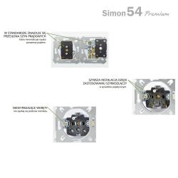 Produkt polski uznanej firmy Kontakt Simon. "Simon 54" to nowoczesna linia premium osprzętu elektro-instalacyjnego oparta o nowe, niezawodne i przyjazne w montażu mechanizmy, wyróżniająca się szlachetną formą oraz bogatą kolorystyką. Osprzęt funkcjonuje jako system ramkowy, symetryczny (1, 2, 3, 4, 5 krotny) umożliwiający zamontowanie wyrobu w opcji poziomej i pionowej. Moduł instalujemy w standardowej puszce Ø60 za pomocą śrub lub szybkozłączki (w zależności od modelu). Do dyspozycji jest pełna gama modułów: łączniki, przyciski, gniazda elektryczne (także z klapką - bryzgoszczelne), gniazda teleinformatyczne, USB, głośnikowe, RTV-SAT itp. Gwarancja producenta na serię "Simon 54" to 6 lat!